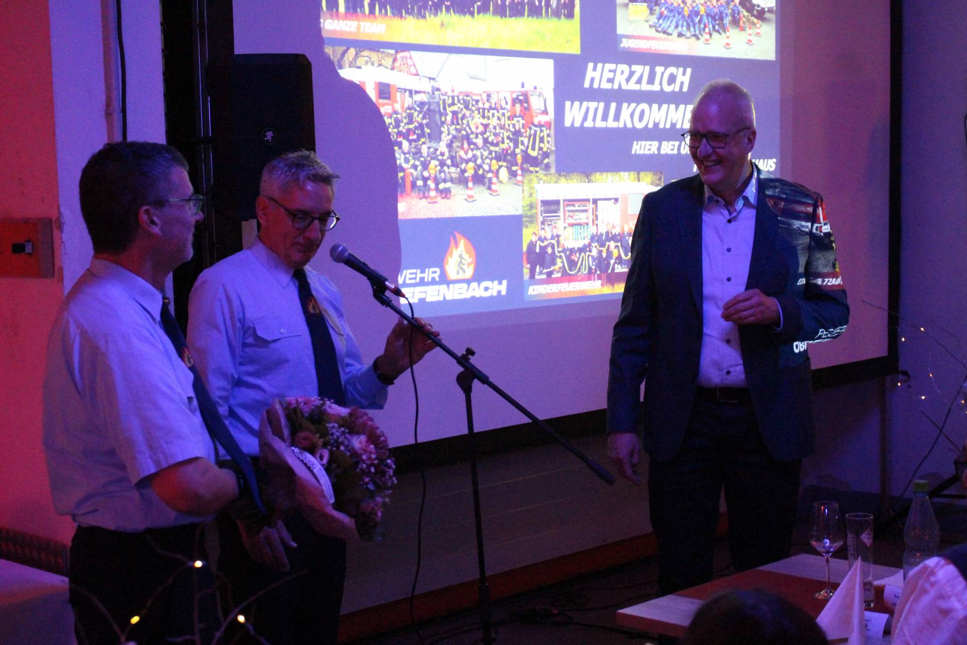 Im Anschluss trafen sich dann alle Teilnehmer und Gäste im Feuerwehrhaus Obertiefenbach. In seiner Begrüßungsrede bedankte sich Michael Mai für die großartige Unterstützung bei den vielen Aktivitäten der Feuerwehr Obertiefenbach. Er stellte fest, dass die Feuerwehr Obertiefenbach tief im Dorfgeschehen verwurzelt sei und man sich jederzeit auf die Feuerwehr verlassen könne.